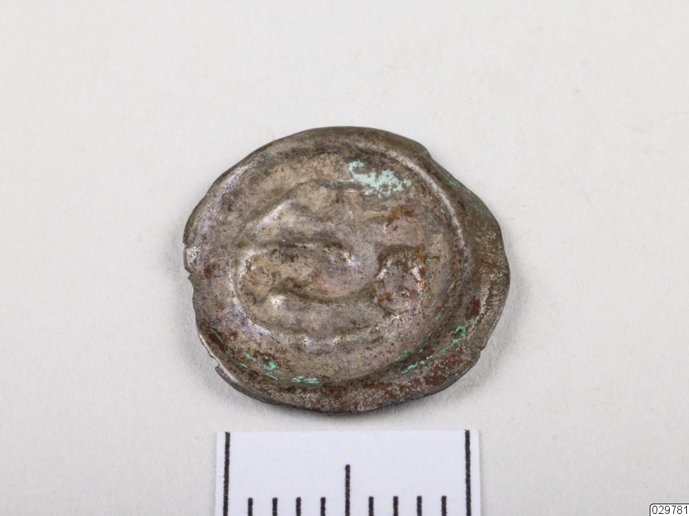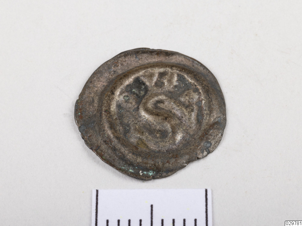 En brakteat från Albrekt av Mecklenburgs tid. 1 penning med ett krönt S.