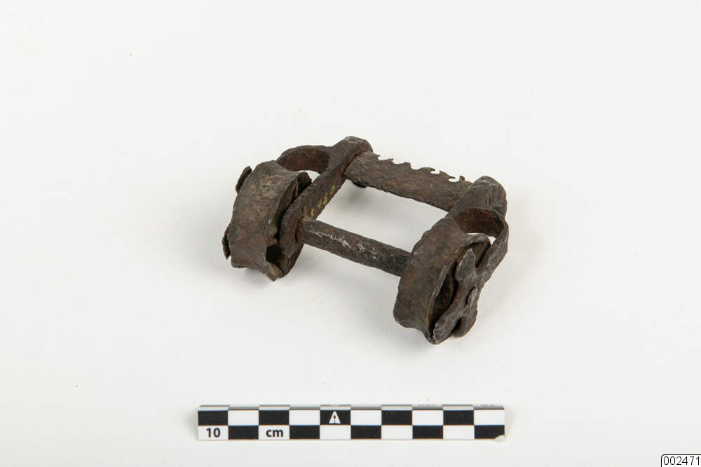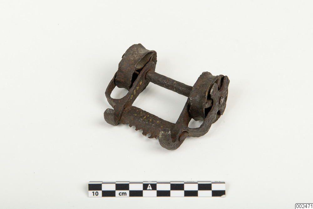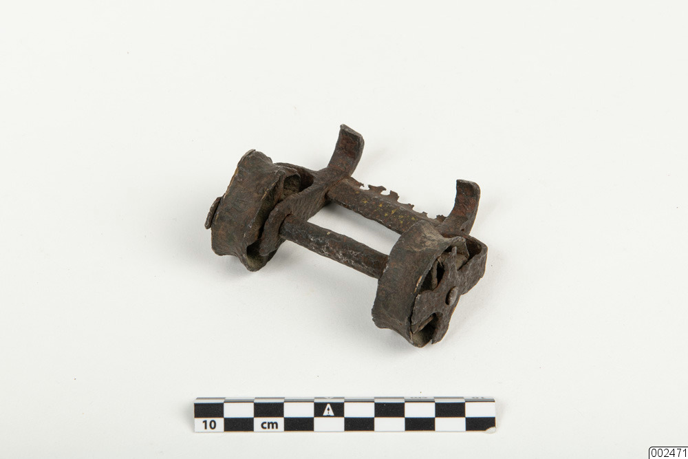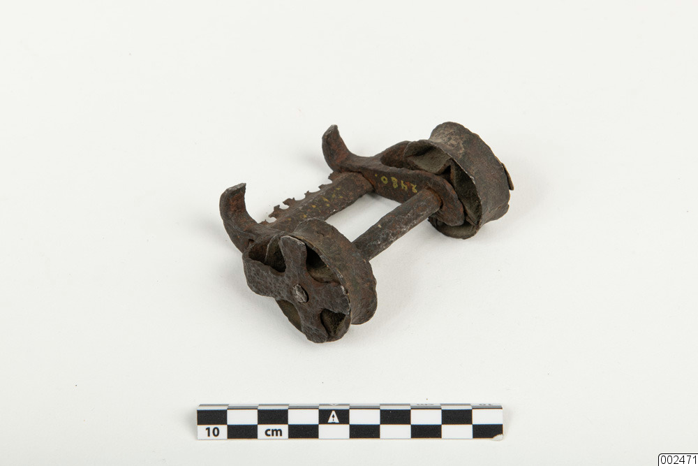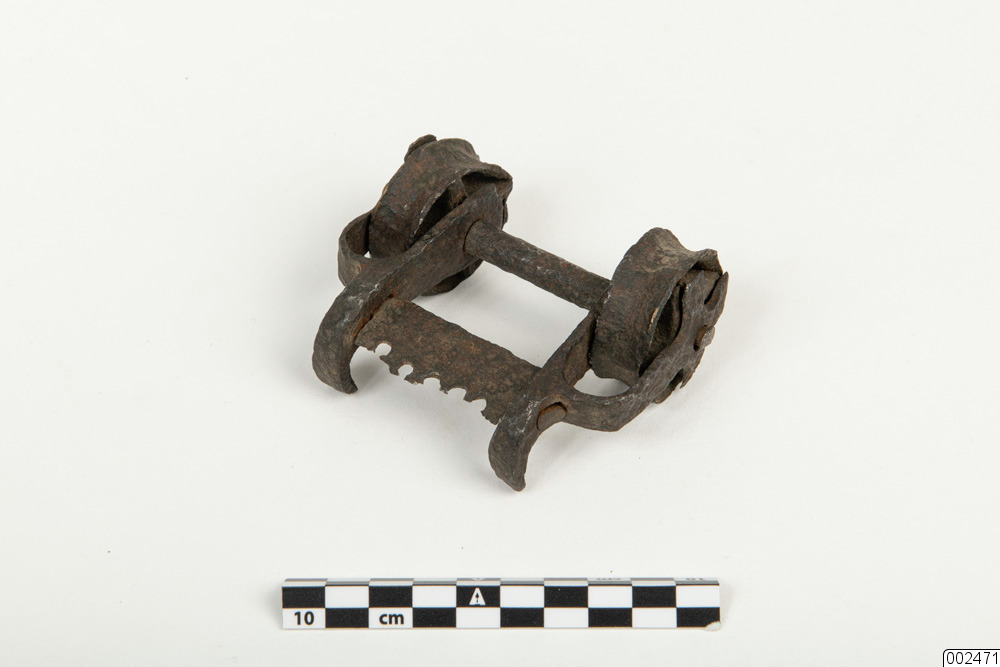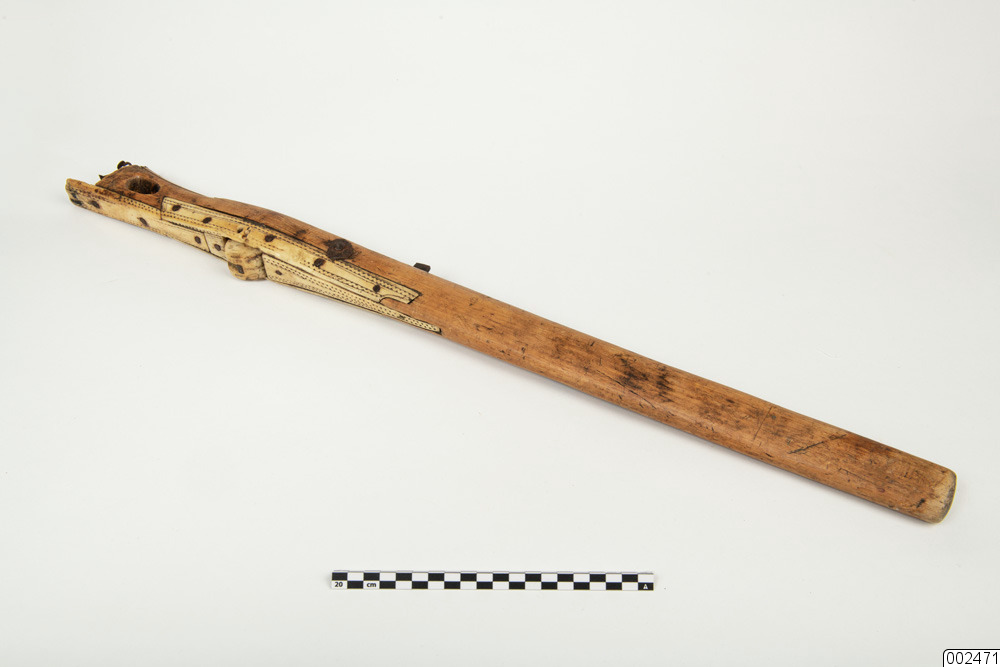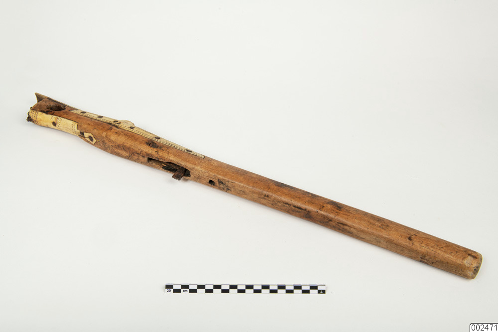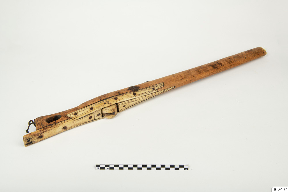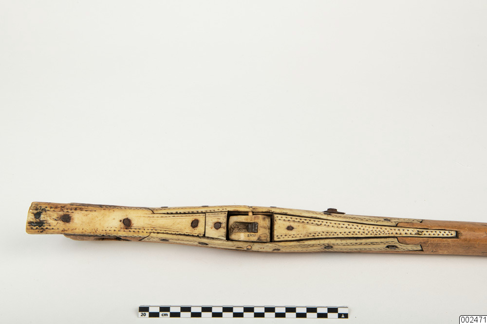 Pilbåge med ornerade benskivor och ristningar i träet.