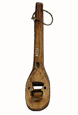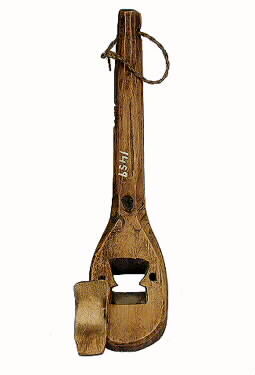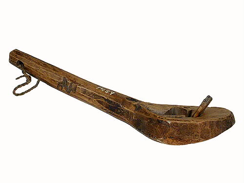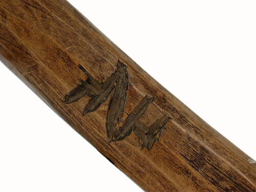 Klös av björk. Snidad med skaft. Brunbetsad. Inskuret på ena sidan: bomärke.
