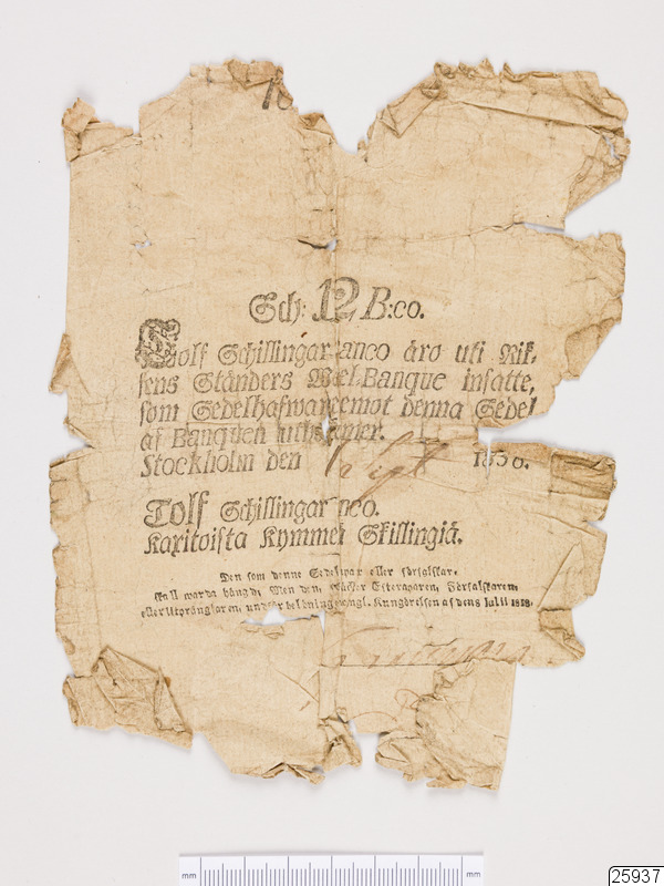Tolf schillingar Banco äro... ...1 sept 1836.