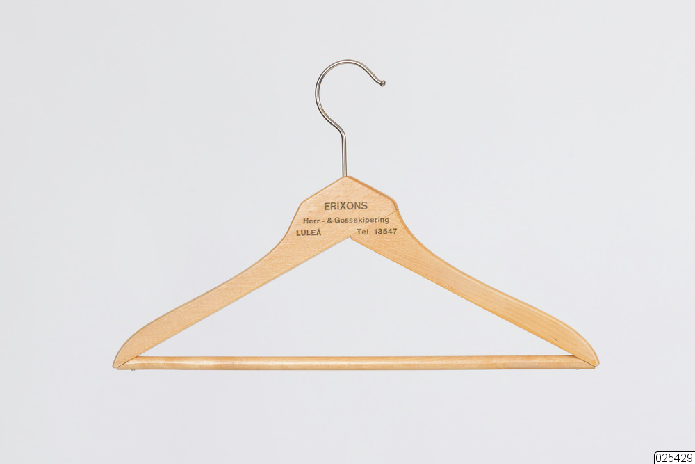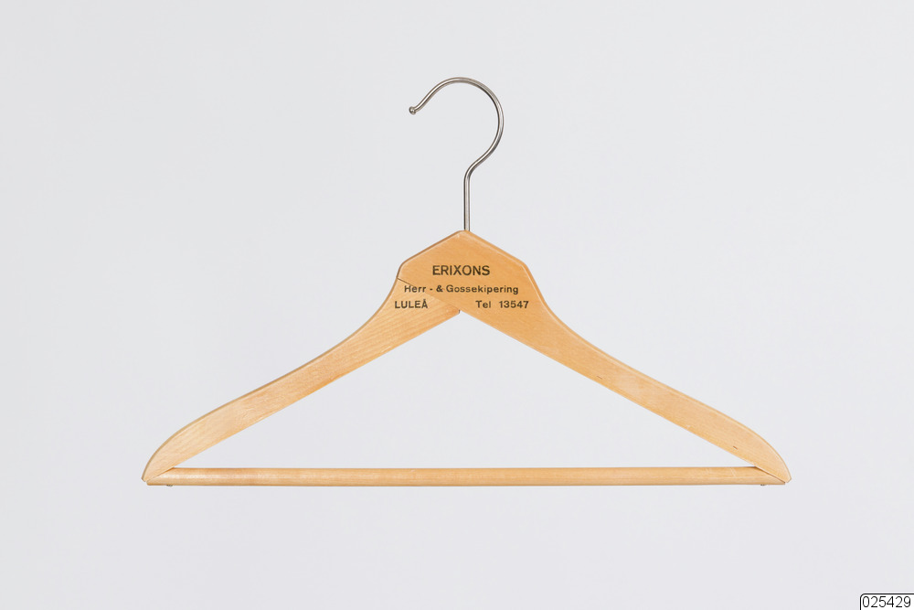 Galge av trä med stång för byxor. Kommer från Erixons Herr- & Gossekipering i Luleå..