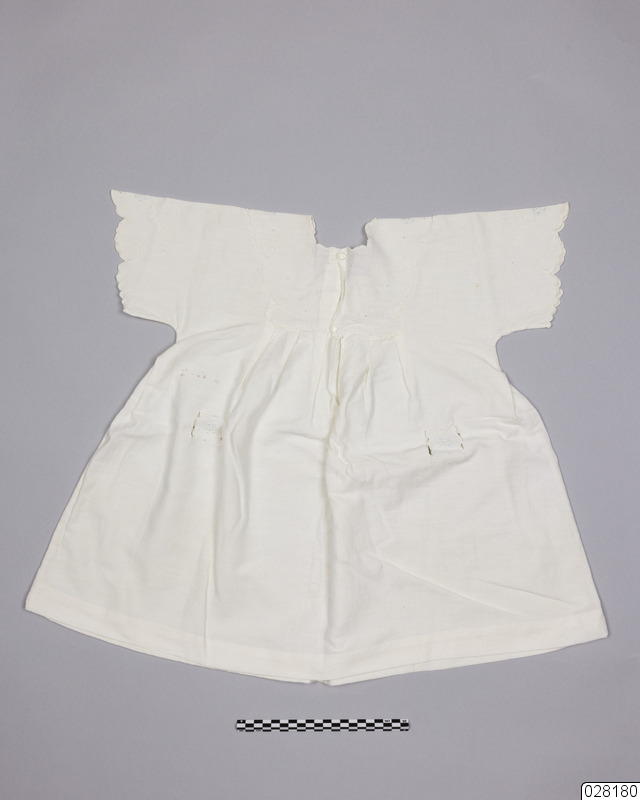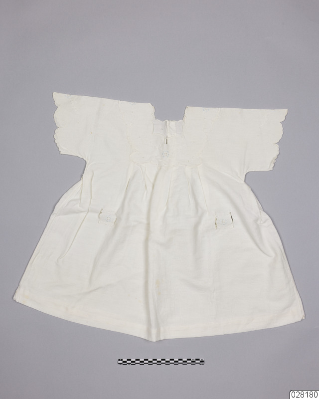 Flickklänning i oblekt bomullstyg. Klänningen är dekorerad med hålbroderier, broderade blommor i ljusblått och blomblad i naturvitt. Samlad i 6 veck mitt fram samt baksida. Veck i sidorna. Ärmar, halsringning och ok är kantade med langettstygn. Stängs med två pärlemorplastknappar i ryggen i samma färg som klänningen. Maskinsydda sömmar, handsydd fåll. Halsringning trasig mitt fram, bakom har lagts en bit tunnt vitt bomullstyg.