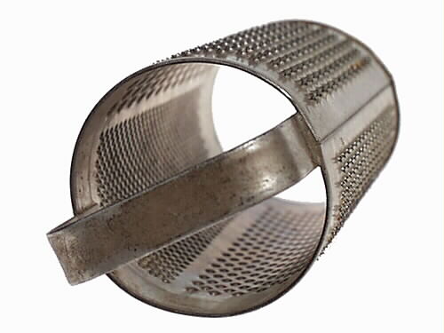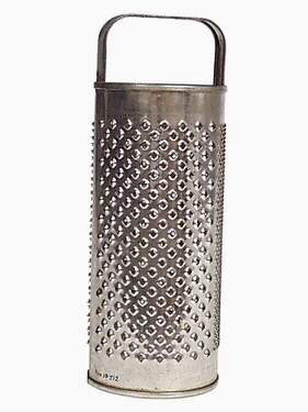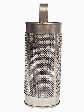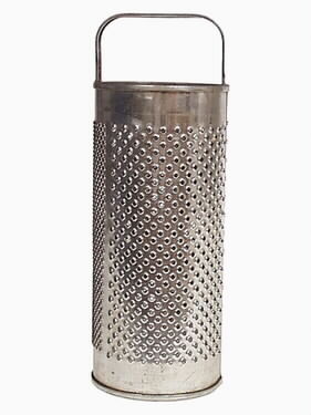 Rivjärn av plåt. Runt rivjärn med fastlött handtag. Tre rivgrovlekar.