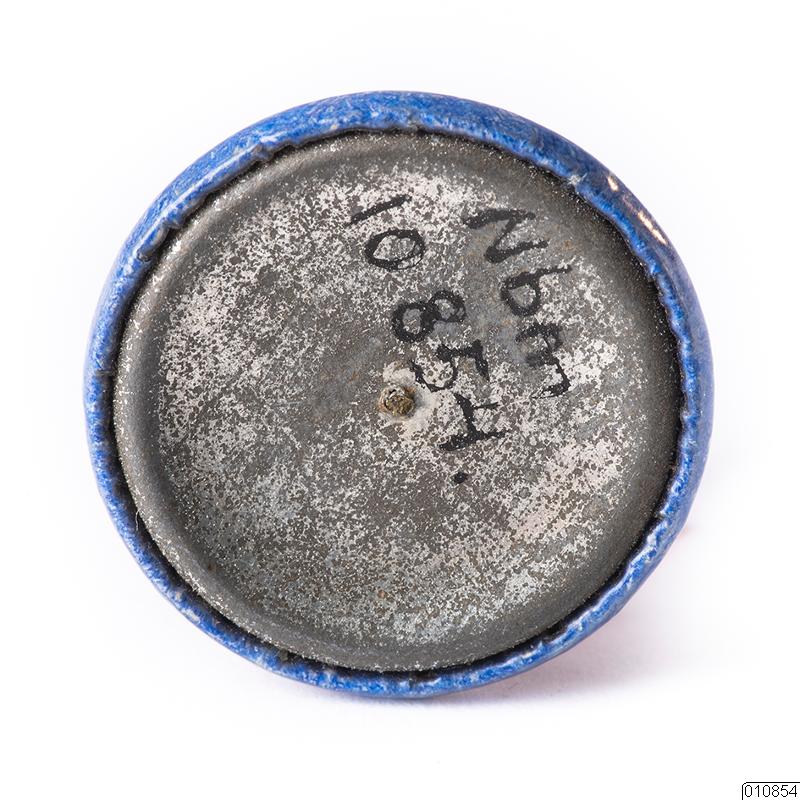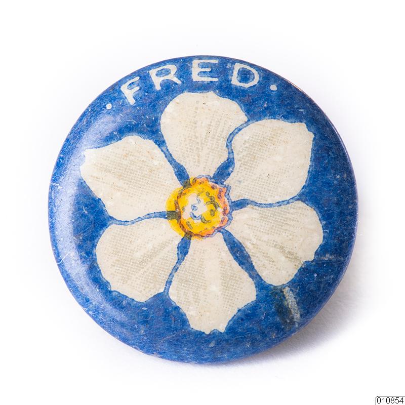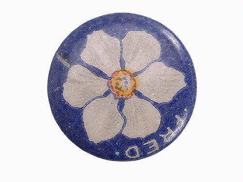 Märke. Fredsmärke. Runt märke av dubbel plåt. På framsidan en påsklilja mot blå botten och vit text: "Fred".