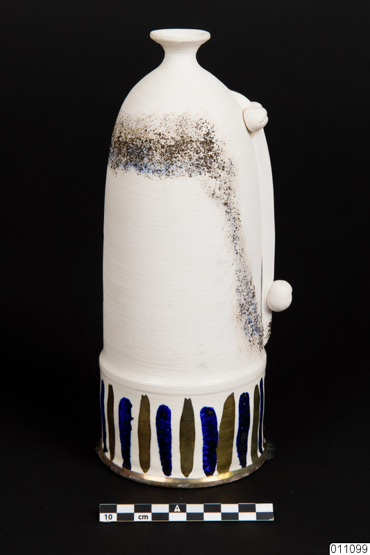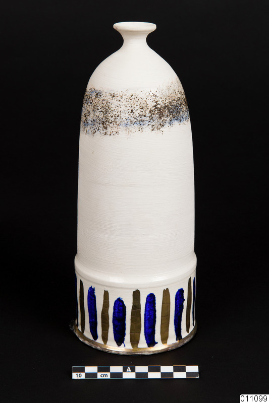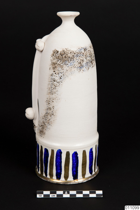 Krus. Vitt krus med utbuktning i stället för handtag. Oglaserat upptill, nedtill transparent glasyr ovanpå målad dekor bestående av stavar i varannan guld och blått och med förgylld kant nedtill. Chamottebeströdd på oregelbundet parti och med svagt blå och gul glasyr på krusets annars oglaserade del. Botten är märkt: "Knekta-66".