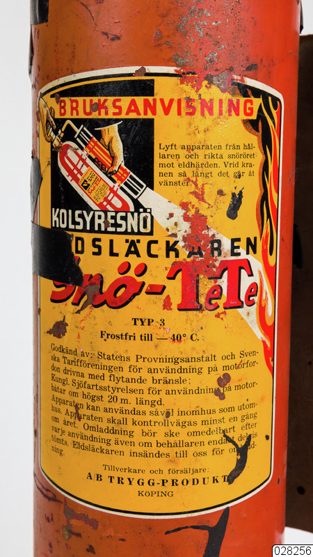 Brandsläckare med kolsyresnö för användning på motorfordon drivna av flytande bränsle. Röd metalltub med svartlackerat cylindriskt släckarmunstycke. Blåmålad skuvventil upptill. Inpräntat på tuben: "IMPORT KOLSYRA CO2 FYLLNING OO2 28 Kg", "06.61 VOLYM 375 Ltr. VIKT 3,95 Kg TARA 3,65 Kg" samt "IWK OBE 1 178K V70MN-2-3165 PR.IR.190 Atm". Tuben har en gul etikett med med texten: "KOLSYRESNÖ", "(...)DSLÄCKAREN Snö-TeTe TYP 3 Frostfri till -40 C." samt instruktioner om användnig.