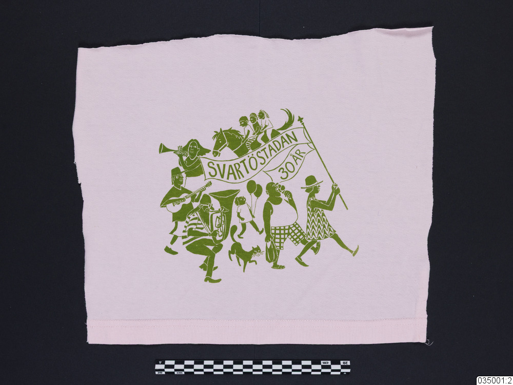 - Provtryck för jubileumst-shirt. En bit ljust rosa bomullsjersey med råa klippkanter fållad i nederkant. Motivtryck i grönt. Trycket föreställer en grupp människor och djur som går i en parad med en flagga. På flaggan står: "SVARTÖSTADAN" samt "30 ÅR".