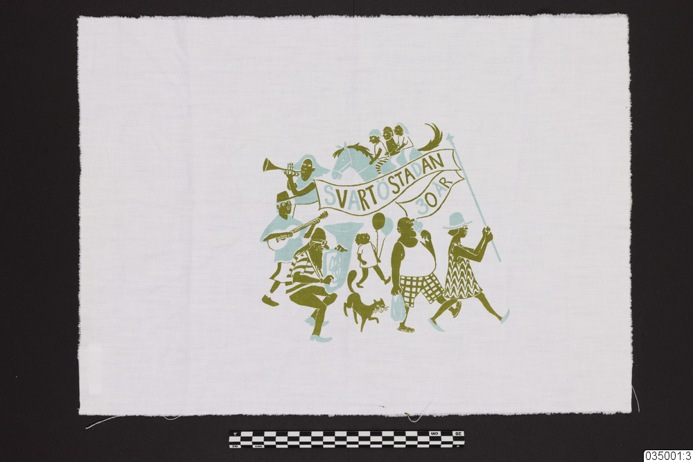 Provtryck för jubileumst-shirt. En bit vitt bomullstyg med råa klippkanter. Motivtryck i olivgrönt och ljusblått. Trycket föreställer en grupp människor och djur som går i en parad med en flagga. På flaggan står: "SVARTÖSTADAN" samt "30 ÅR".
