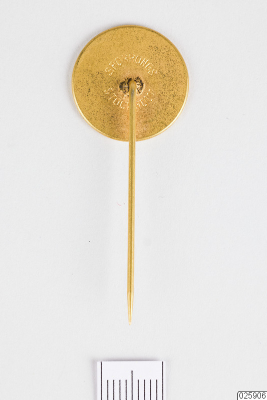 - Märkesnål i guldfärgad metall. Nål med rund märkessköld. På skölden står det: "SKANSENS 25-TE VÅRFEST" utmed kanten. I mitten finns en strålande stjärna samt bokstäverna: "NM". På baksidan av märkesplattan står det instämplat: "SPORRONG" och "STOCKHOLM".