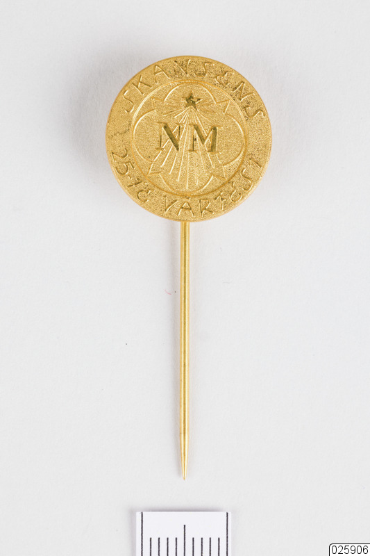 Märkesnål i guldfärgad metall. Nål med rund märkessköld. På skölden står det: "SKANSENS 25-TE VÅRFEST" utmed kanten. I mitten finns en strålande stjärna samt bokstäverna: "NM". På baksidan av märkesplattan står det instämplat: "SPORRONG" och "STOCKHOLM".