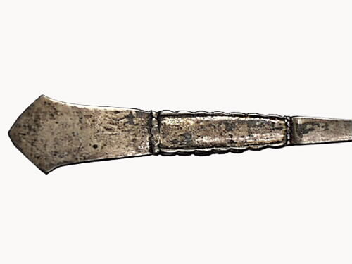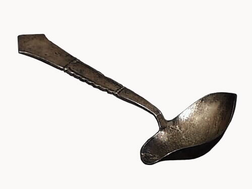 Såssked. Fabrikstillverkad såssked av nysilver med hamrat utseende. Stämplad: Prima NS import, P samt 2 torn i en oval.