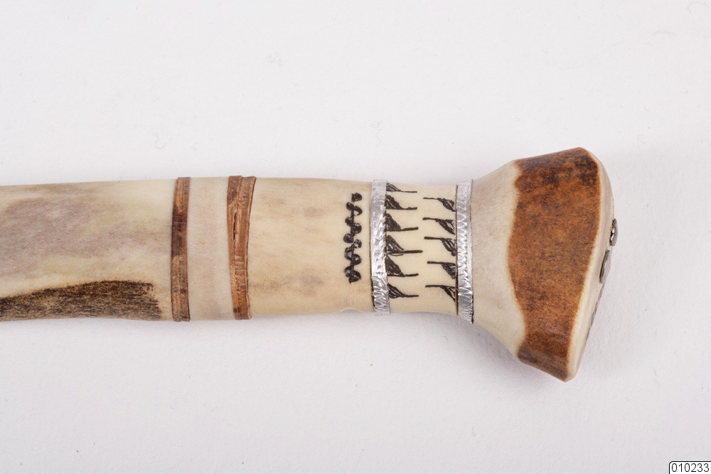 b) Kniv. Skaftet i renhorn, ristat och ristningen fylld med tusch, infällt, näver och tenn. Knivbladet märkt: B&S.