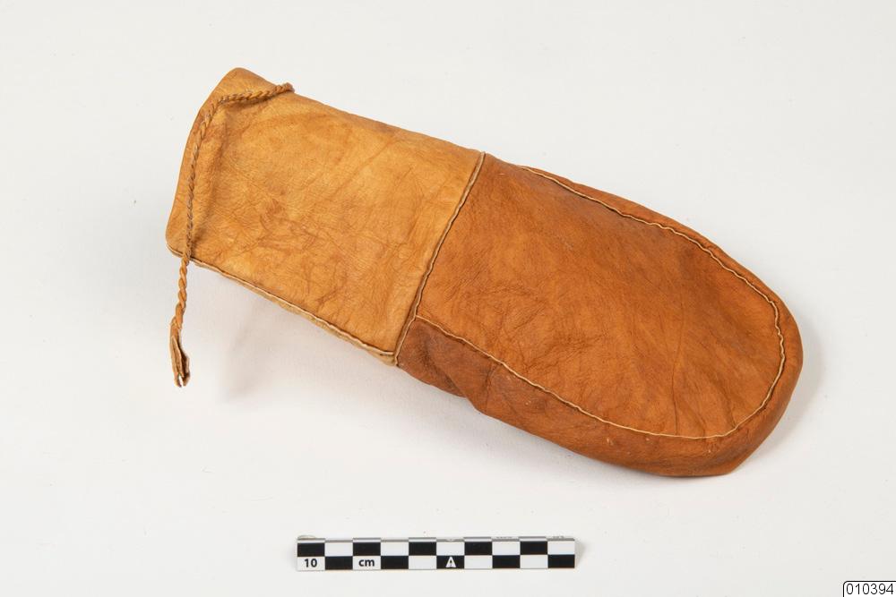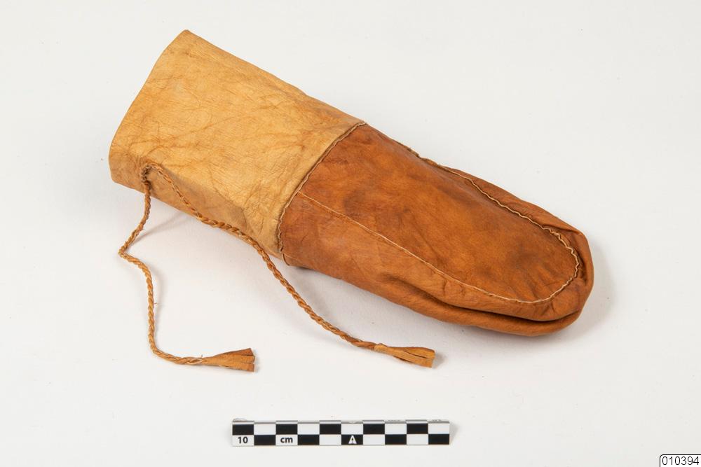 Kaffepåse, sydd av garvat renskinn. Påse med rundad botten, hopsydd av 4 skinnbitar och med förstärkningsbitar i sömmarna. Upptill ett snöre påsytt, av tvinnat garvat renskinn med tofsar utsparade i ändarna.; Kaffepåse. Påse med avrundad botten, hopsydd av 4 skinnbitar och med förstärkningsbitar i sömmarna. Upptill ett snöre påsydd, av tvinnat garvat renskinn med tofsar utsparade i ändarna.