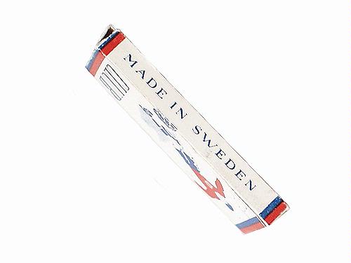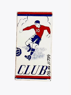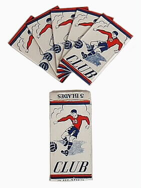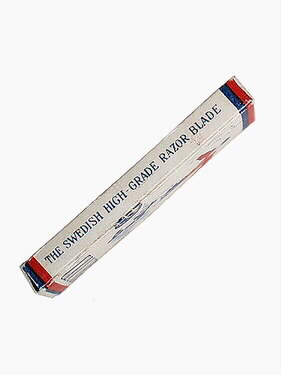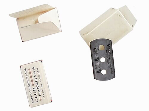 Rakblad. Ask innehållande fem rakblad, inslagna i papper. Askens fram- och baksida tryckt: rött, vitt och blått, en fotbollsspelare, club - samma tryck på rakbladens omslagspapper. Smalsidors tryck: The Swedish high-grade razen blade, made in Sweden. Kortsidornas tryck: 5 blades.