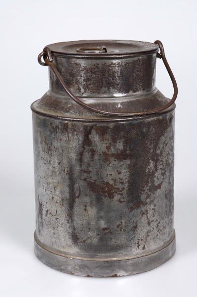 Rund mjölkhämtare med kort och tjock hals. Mjölkhämtaren är försedd med ett bottenband (H 1,8 cm) som höjer botten från underlaget. Hämtaren har ett vikbart ståltrådshandtag.