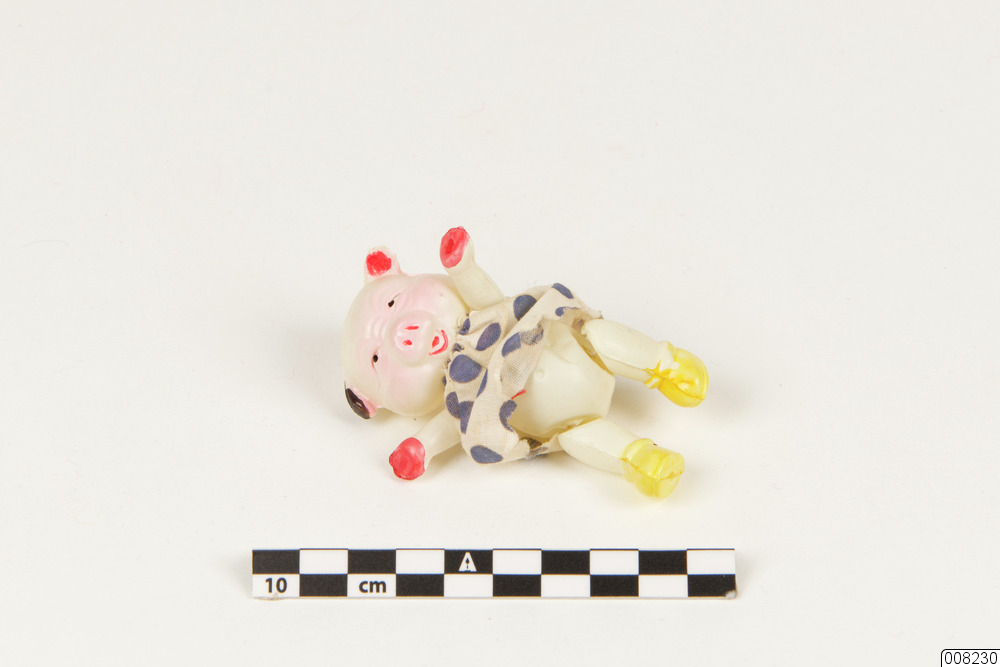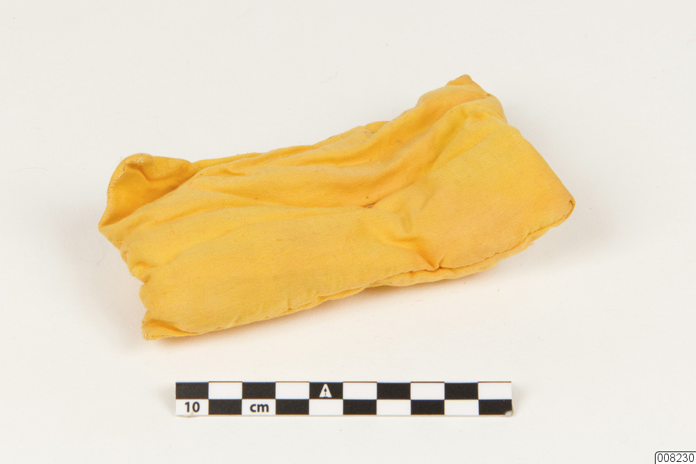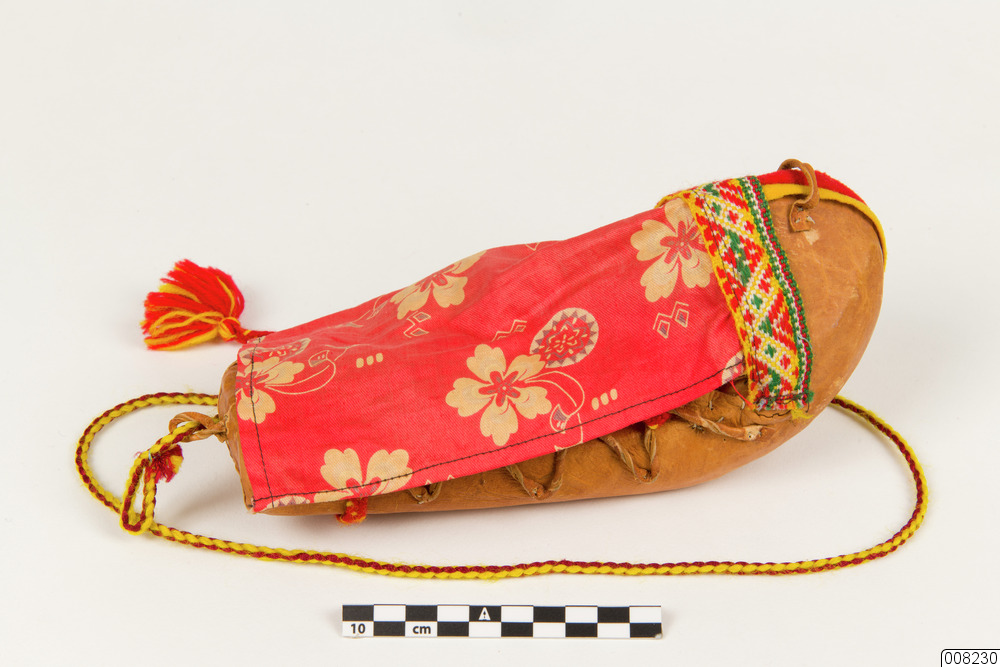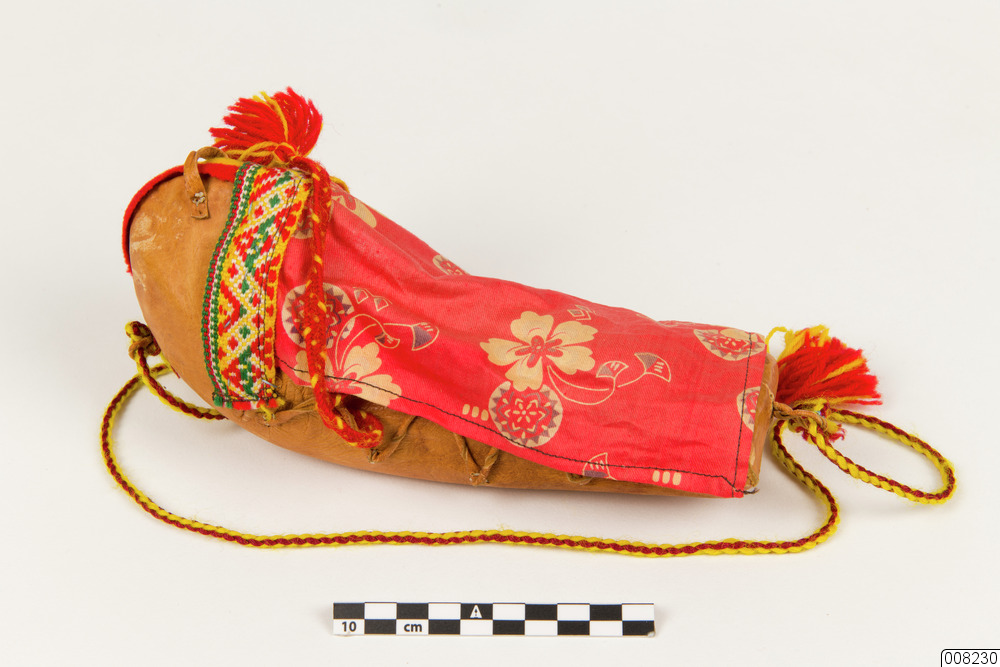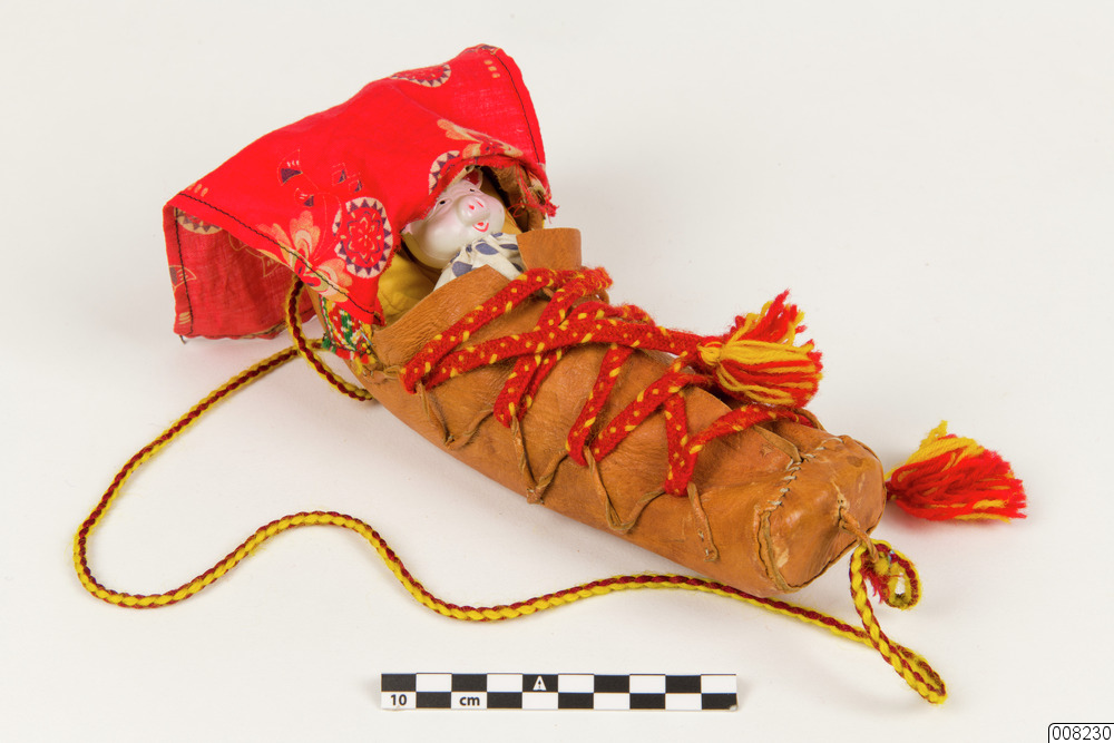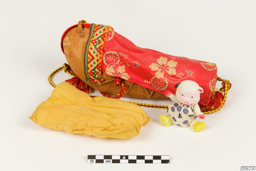 - Giethka. Leksaksvagga bestående av a) vagga av urholkat trä, klädd med läder, innehållande b) en celluloidgris och c) gult bomullstäcke, med flätade band av gult och rött garn med tofsar. Ansiktskydd av rött mönstrat bomullstyg. Antal delar 3 st.