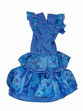 Klänning för docka. Blå balklänning med figursydd överdel och volangkjol. Klänningen har korta rynkade ärmar och volangkjol med blå blommor på mörkblå botten. Överdelen är av ett glansigt enfärgat mörkblått material. Klänningen är fodrad med samma material. V-formad krage med dold knäppning i ryggen med två silverfärgade tryckknappar. Dold märkning i knäppningen: "EC" med röd tråd.