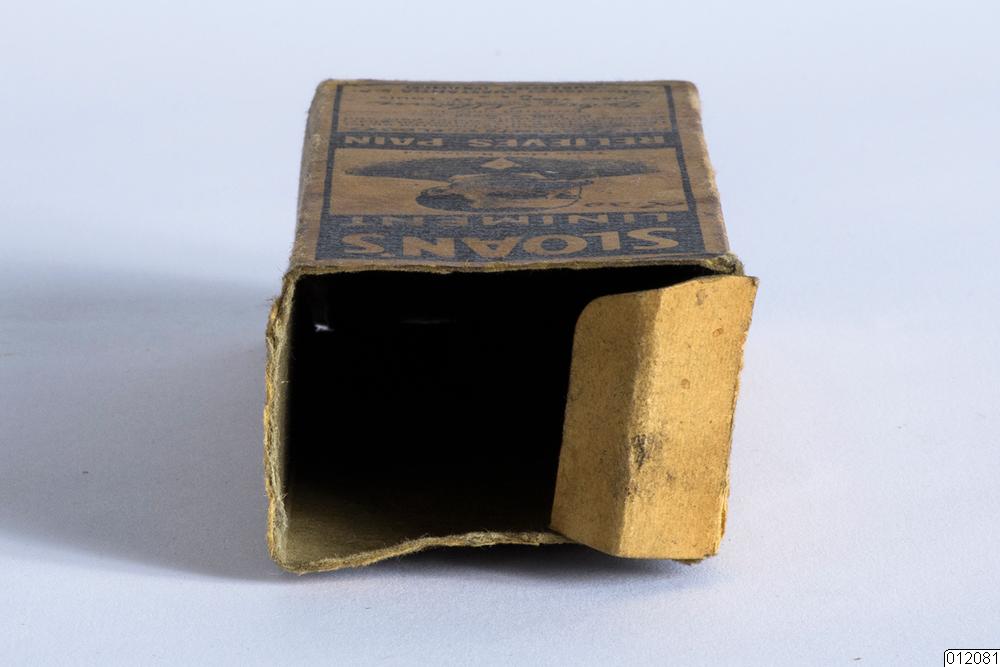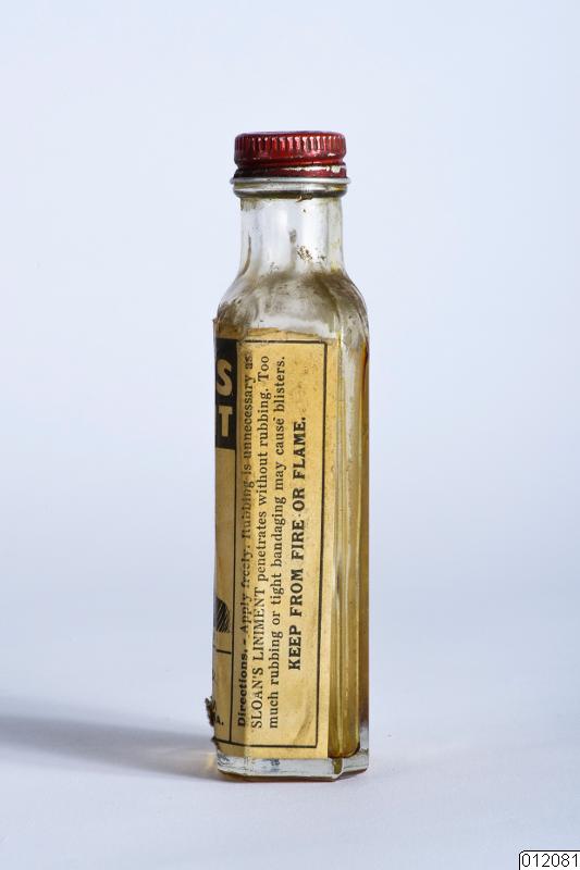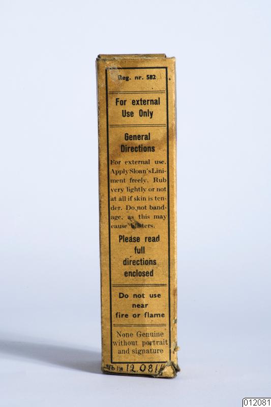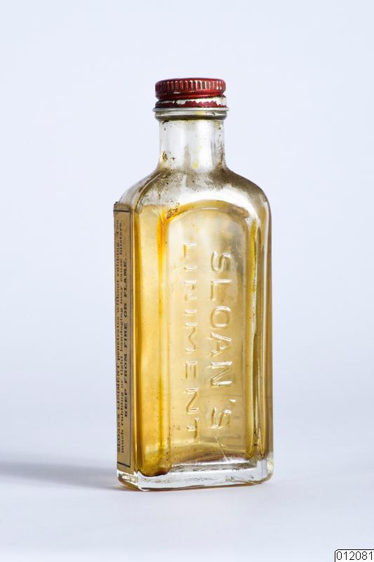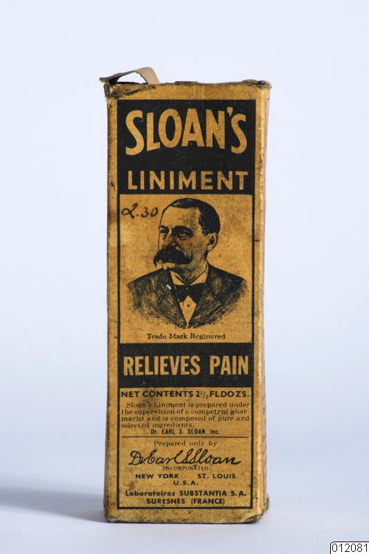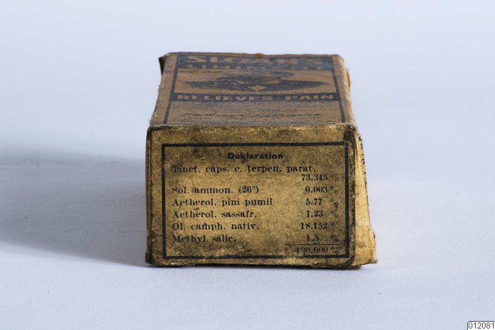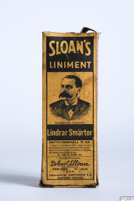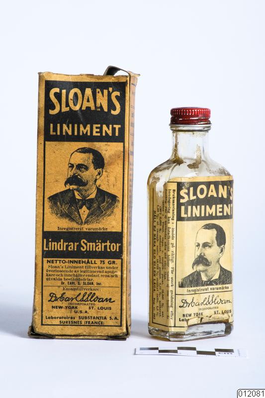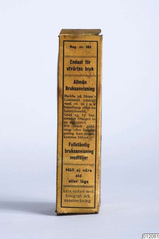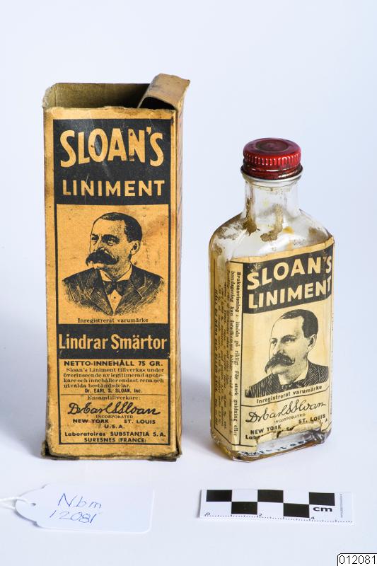 Liniment. Flaska av glas och plåt med ursprunglig papplåda.