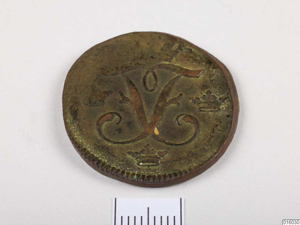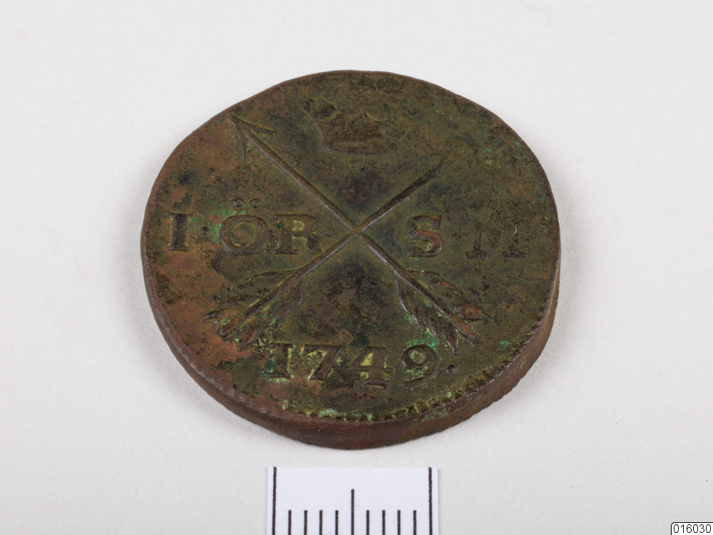 - Mynt. Runt kopparmynt med 1 ÖR SM, 1730", två korsställda pilar och en krona, präglade på en sida. På omstående sida finns motställda F omgivna av tre mindre kronor och en stor krona över. Myntets kantprofil är deformerad.