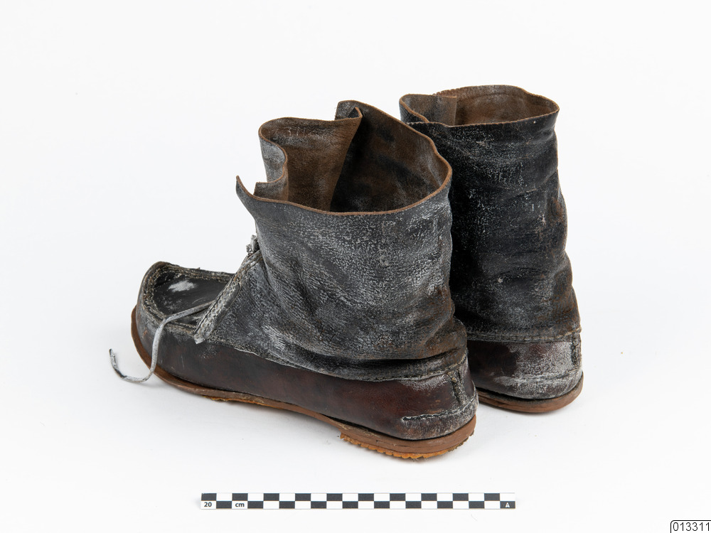 Näbbsko. Ett par svarta näbbskor med fast plös och remmar. Brun hårdgummisula under tunn rågummihalvsula och lågrefflad rågummiklack på hårdgummi. Dessutom extra remhål upptill på b.