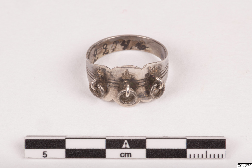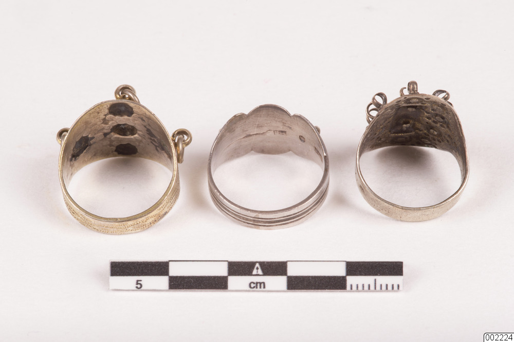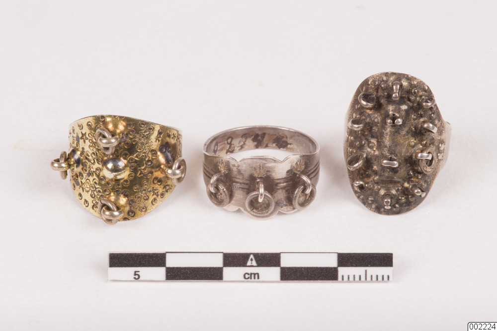Ring. Silverringar med samiskt ursprung. Antal delar: 3 st. En av ringarna är delvis förgylld utvändigt (diameter: 2 cm, höjd, största: 2 cm.)