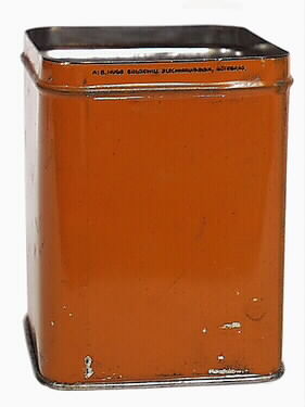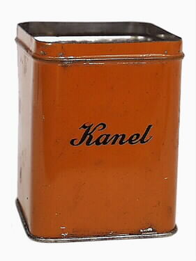 Kryddburk i två delar bestående av en fyrkantig ockragul burk med en list längs övre kanten. Märkt: Kanel i svart.