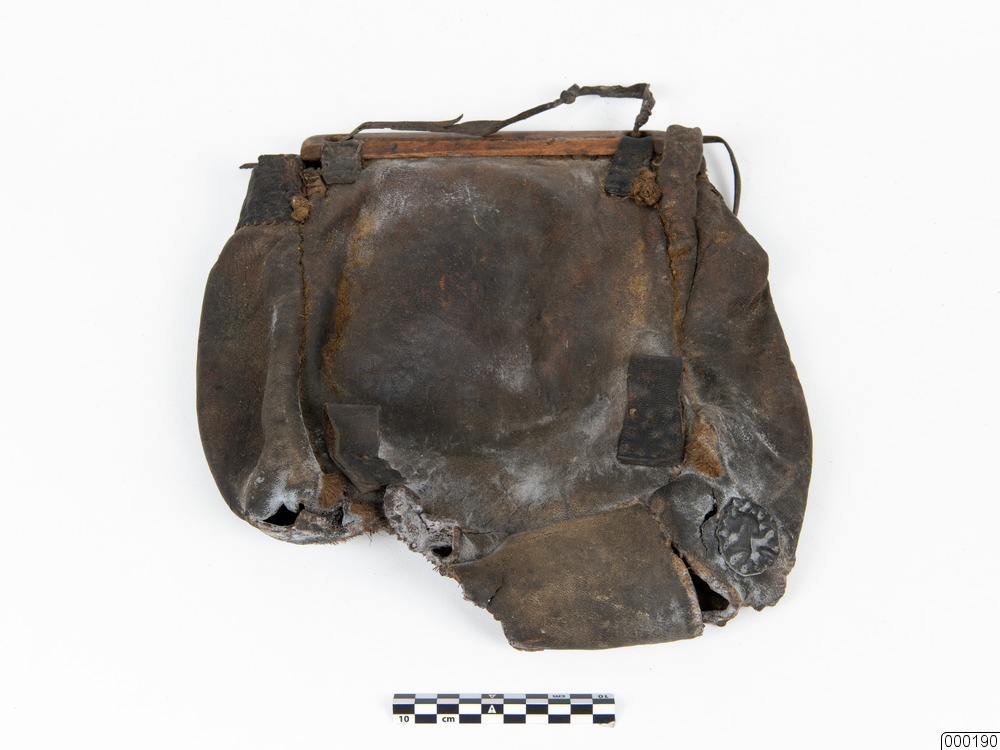 Handväska av sälskinn. Upptill med tvärslåar av björk, läderband som bärremmar.