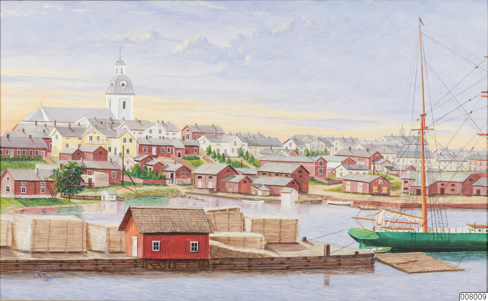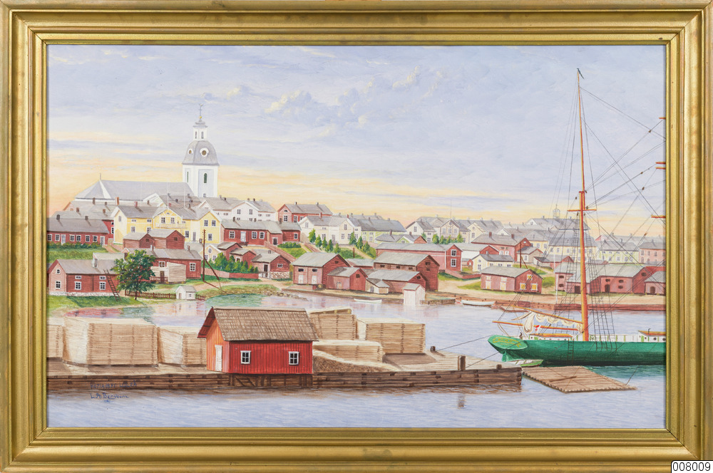 Tavla målad av L A Bergbom föreställande Norra hamnen Luleå 1895, med förgylld träram.