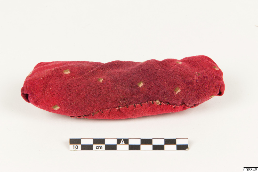 Madrass. Möjligen madrass till leksaksvagga, av rött ylletyg, med prickar i grönt och vitt, och stoppad. Något rundad i formen.
