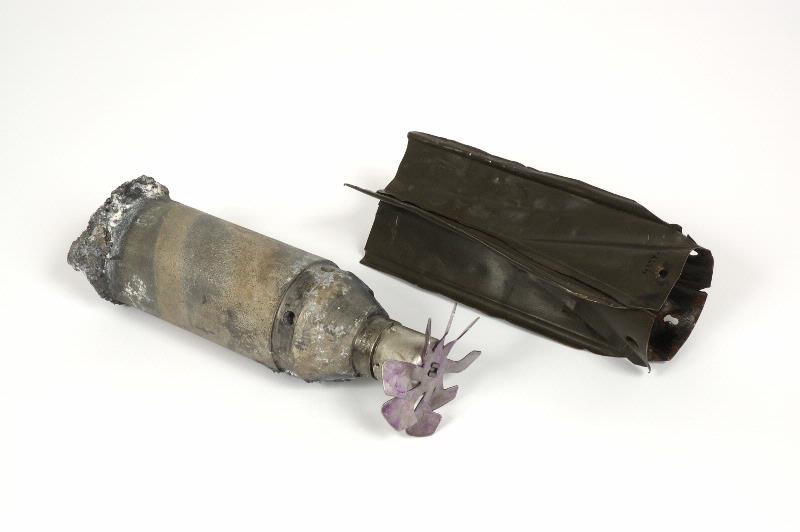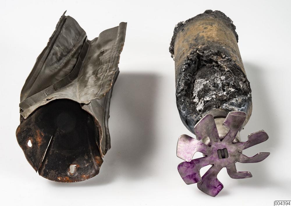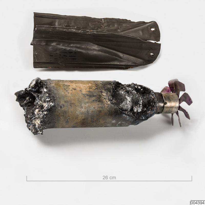 Bomb. Rester av bomber fällda över Pajala den 21:a februari 1940. Fragment bestående av splitter, rester av propeller mm. Termitbomb, försedd med en liten snurra, som säkrar tändröret under transport. Det står 246 på kroppen, 297 61 38 på kroppen nära snurran samt 11N16, XB3 och 1938 på ringen mellan kroppen och snurran. Antal delar: 6 st.