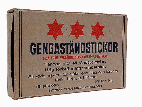 - Ask i två delar; en låda med fem sidor, vilken skjuts in i ett fodral med kortsidorna öppna. I asken ligger sex så kallade gengaständstickor. Var och en är 9 cm lång och har över drygt halva tändstickan en silverliknande massa. I toppen är stickan gul. Över stickorna ligger en bit wellpapp (dubbelt papper som är veckat på ena sidan). Utanpå asken text: "Gengaständstickor/fria från bestämmelserna om explosiv vara/tändas mot ett tändsticksplån/..." mm. Antal delar: 9 st.