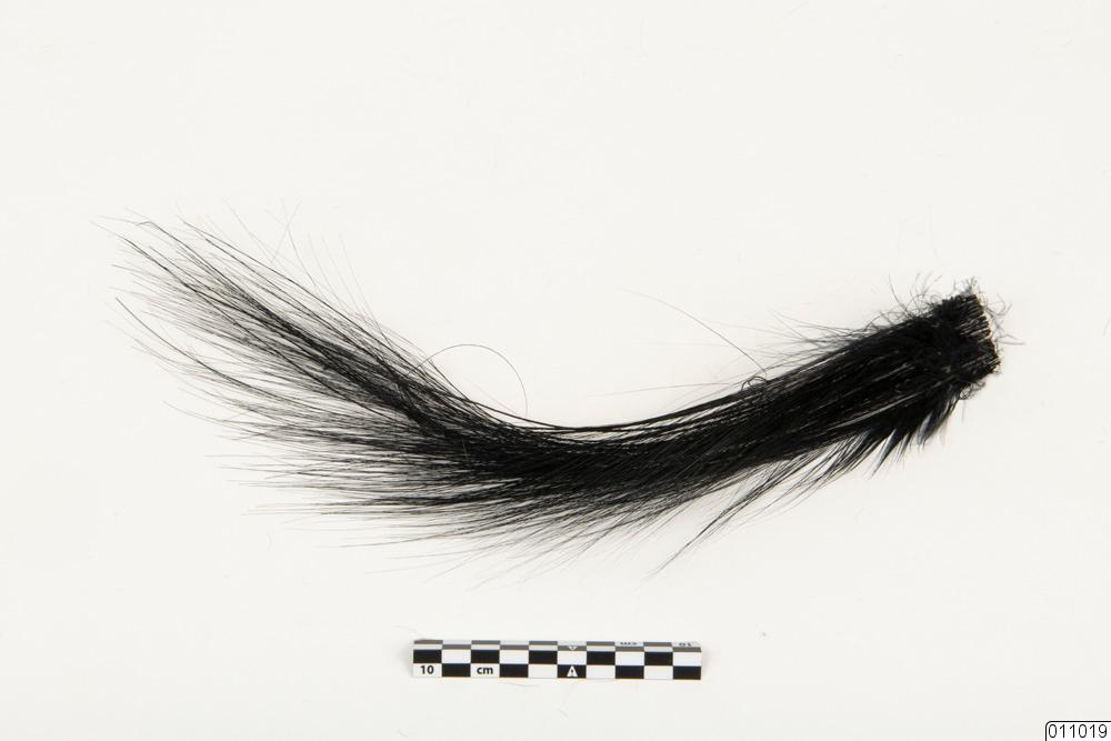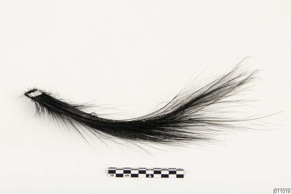Fjäder. 20 st svarta hägerfjädrar ihopfästade till en.; Fjäder (ägrett) från häger i svart bestående av 20 st ihopfästade fjädrar.