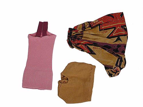 Fodral i ljungfärgat (rosa) muddtyg med lila axelband samt byxkjol i melerat tyg i bl.a. senapsgult (gulbrunt) och brunt med tillhörande topp i senapsgult.