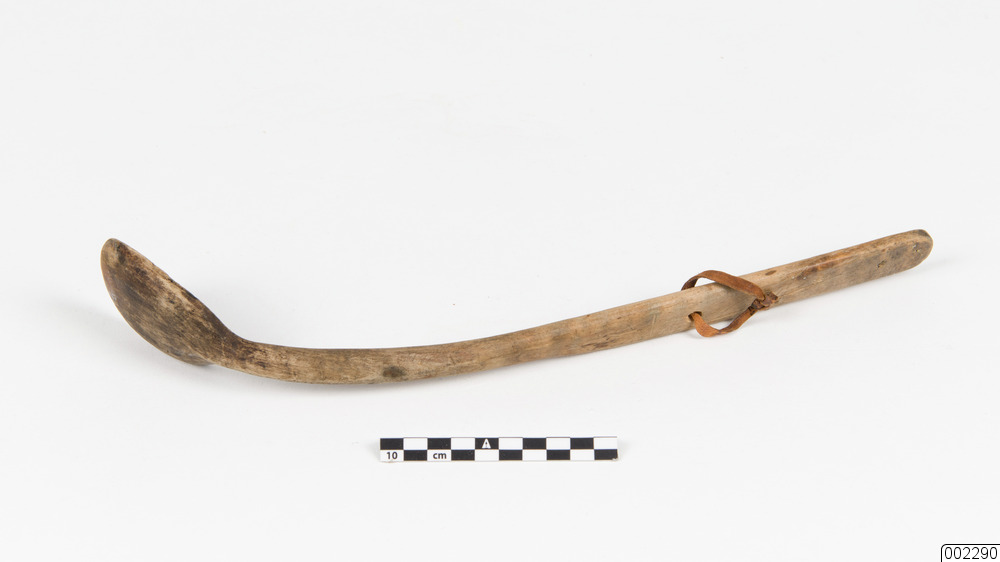 - Slev med ett långt skaft. Den är märkt med ett bomärke bestående av ett kors med en triangel vid toppen med spetsen åt vänster. Stammen är tre gånger längre än det vågräta tvärstrecket och triangelns sidor är lika långa som tvärstrecket.