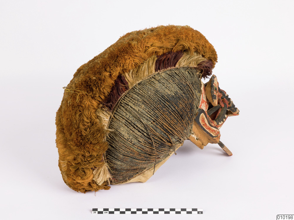 Mask. Ansiktsmask av täljt trä, genombruten, målad, med ögon av snäckskal. Fäst vid huvudbonad av kokosbast och tyg, krönt av en manliknande rem av kokosbast. Höger sida täckt av svartmålade snören, vänster kritad och besatt med instuckna trästickor. Röd, vit, brun och svart.