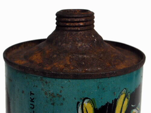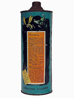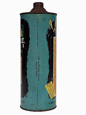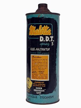 Flaska. Rund flaska av plåt med gängad hals, målad i färgerna grönt, svart, gult, vitt och orange. Följande text står på flaskan: Maletta D.D.T spray 3 Flug o. maltinktur Förstärkt D.D.T preparat. Malsäker........