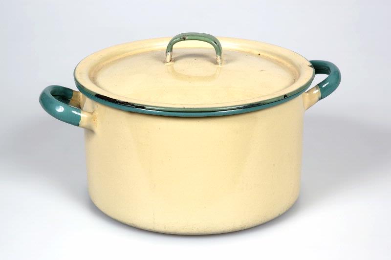 Grytan är emaljerad i crémefärg förutom mynningskanten, grytans två bärhandtag och lockets handtag, som är gröna. Insidan av grytan är emaljerad i grått. Botten är planslipad i koncentriska cirlkelspår.