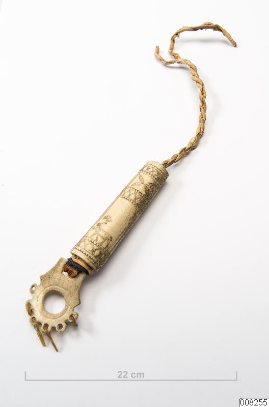 b) Snodd av läder som fortsätter i själva nålhållaren. I denna fastsytt blått och rött kläde, i vilket är instucket en metallnål med sentråd. Genombruten benskiva med hängen bildar ändhållare. Dess mått: ca 6 x 4 cm med hängen inräknade.