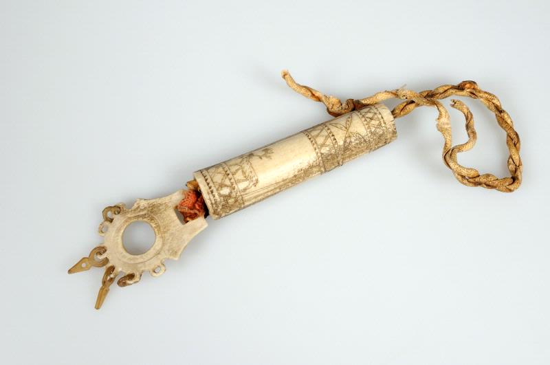 Nålhus av urholkat renhorn bestående av a) Nålhus, L 8,5 cm, Diam 2 cm. Dekor: Avgränsade fält , ristade mönster, karvsnitt. Motiv: Same med ren, bladmotiv och rutmönster.