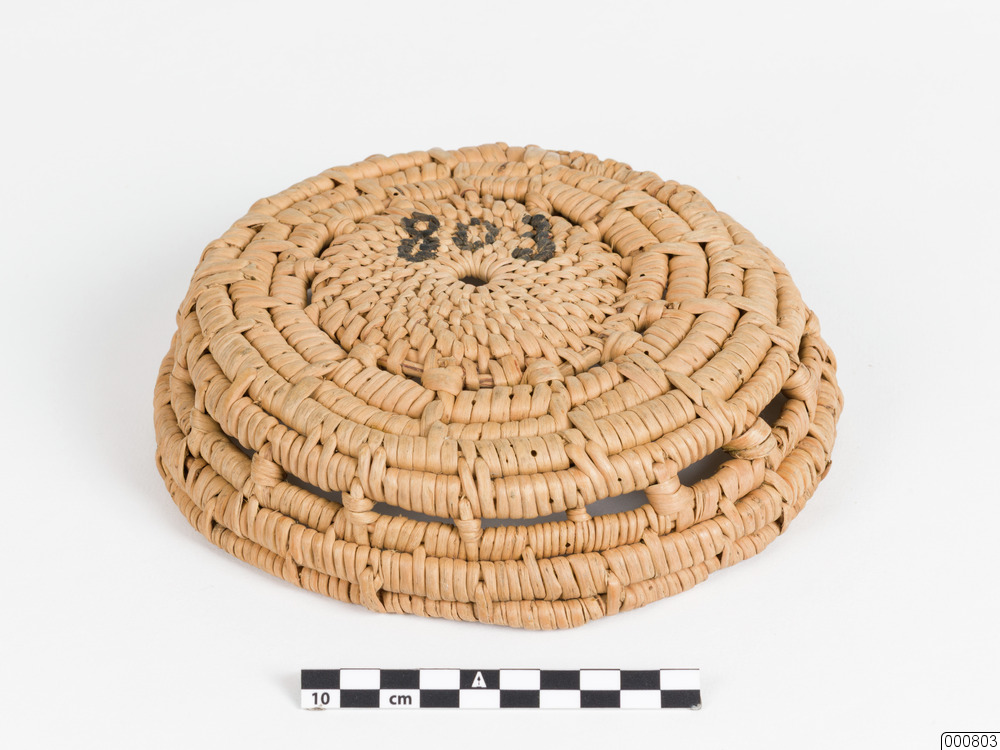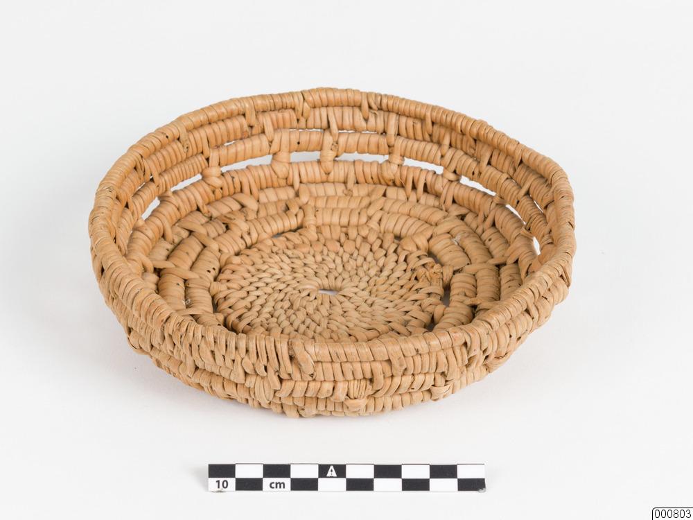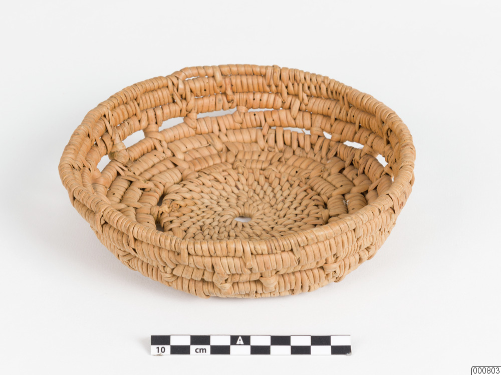 Ostkorg. Rund ostkorg, flätad av rottågor.