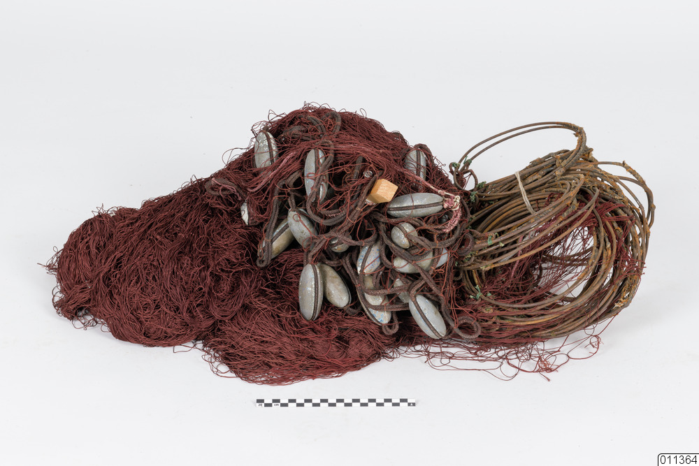 Laxnät. Varvantal: 9 varv/aln. Färg: rödbrun. Underteln av spunnen nylonlina med fastknutna järnringar, Diam 20 cm, för att förhindra att nätet fastnar i botten. Flötena är gjutna plastovaler, rundade, L 8 cm.