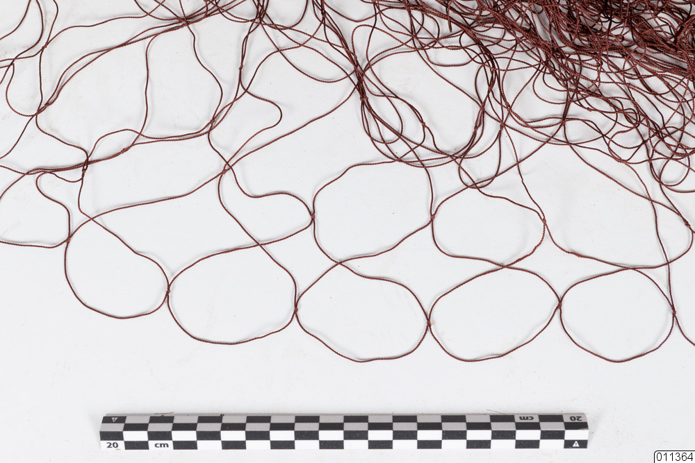 Laxnät bestående av underteln av rödbrun spunnen nylonlina med varvantal 9 varv per aln med fastknutna järnringar Diam 20 cm, för att förhindra att nätet fastnar i botten. Flötena är gjutna plastovaler, rundade L 8 cm.