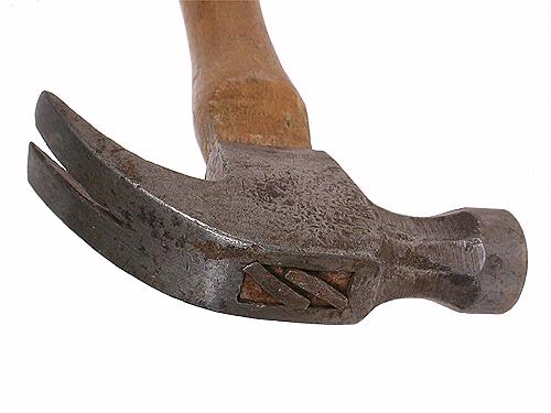Hammare med järnhuvud. Järnhuvudet har på ena sidan en rund slagklack (Diam 2,4 cm) och på andra en "kofot". Huvudet är fastsatt med två diagonalinslagna metallkilar i toppen av ett fernissat trähandtag (Diam 3,5-2,2 cm) som löper genom huvudet. Handtaget har konvex greppdel och ett hål för upphängning.