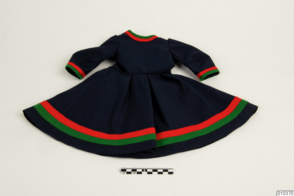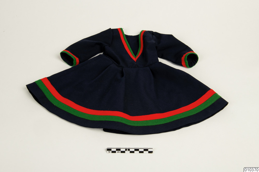 a) Dockdräkt av terylene och blått, grönt och rött ylleflanell. Blå botten, avtagen vid midjan. Klockad och veckad kjol. V-ringad fram, bandgarneringar i ärmar, på kjolen och i halsen. L mitt bak 38 cm, liv 14,5 cm, kjol 23,5 cm.