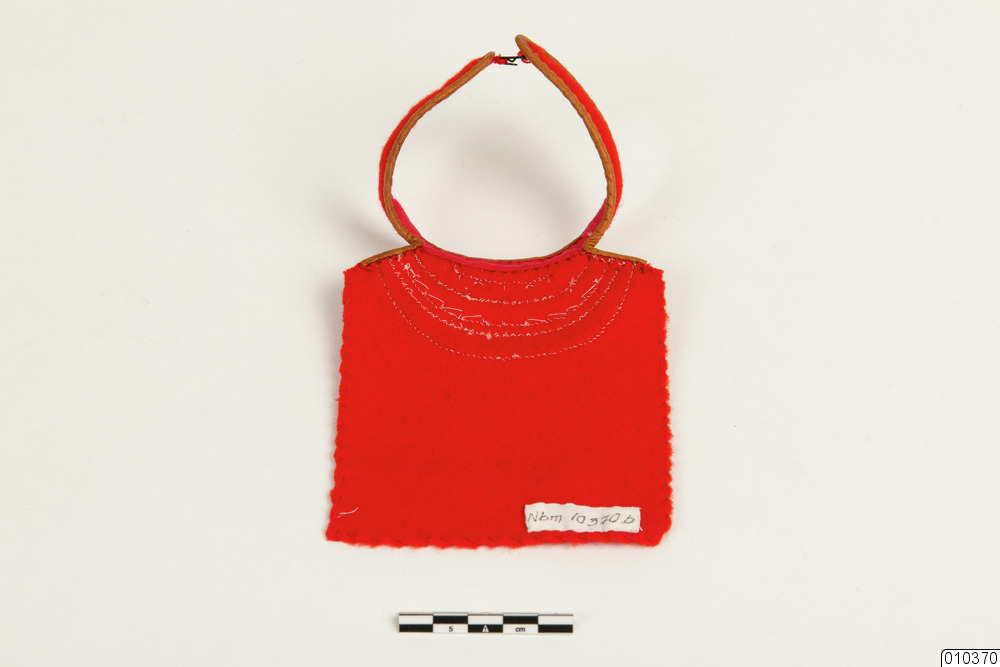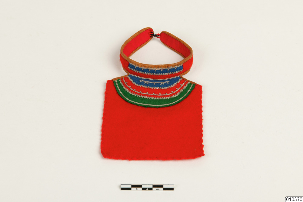 b) Barmkläde av röd, grön och blå ylleflanell, läder, tenntråd och bomullstyg. Röd botten, applikation i grönt, rött, blått samt tenntrådsborderad. Läderkantad ståkrage, fodrad med rött bomullstyg. Stycket handkastat. Försedd med hake. L mitt fram 12 cm, B 10 cm.
