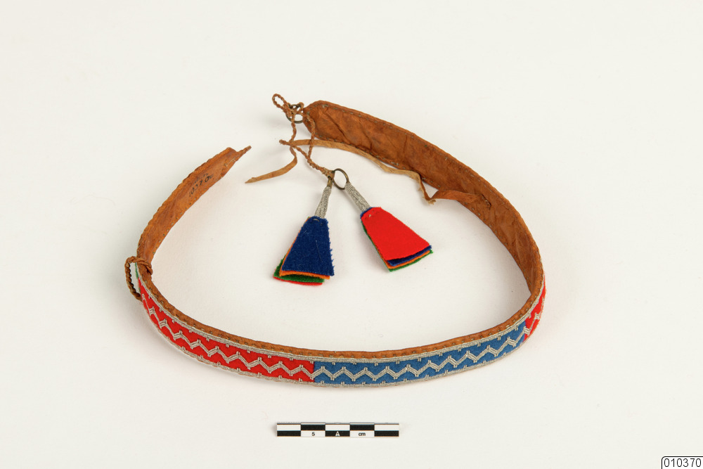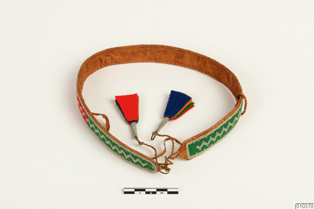 c) Bälte med baksida av renhud och framsida av grön och röd filt, tenntråd, orange och blå filt i tofsarna samt röd flanell. 3 st metallringar. Uppdelade fält i filt, tentrådsbroderade. Knytskärp.
