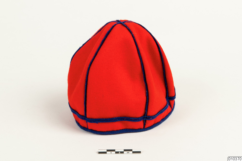 d) Mössa av röd och blå ylleflanell. Röd botten, kantad med blå ylleflanell. Jokkmokkstyp anm. ÖW/Örjan Wallström. H 16 cm, O ca 45 cm.