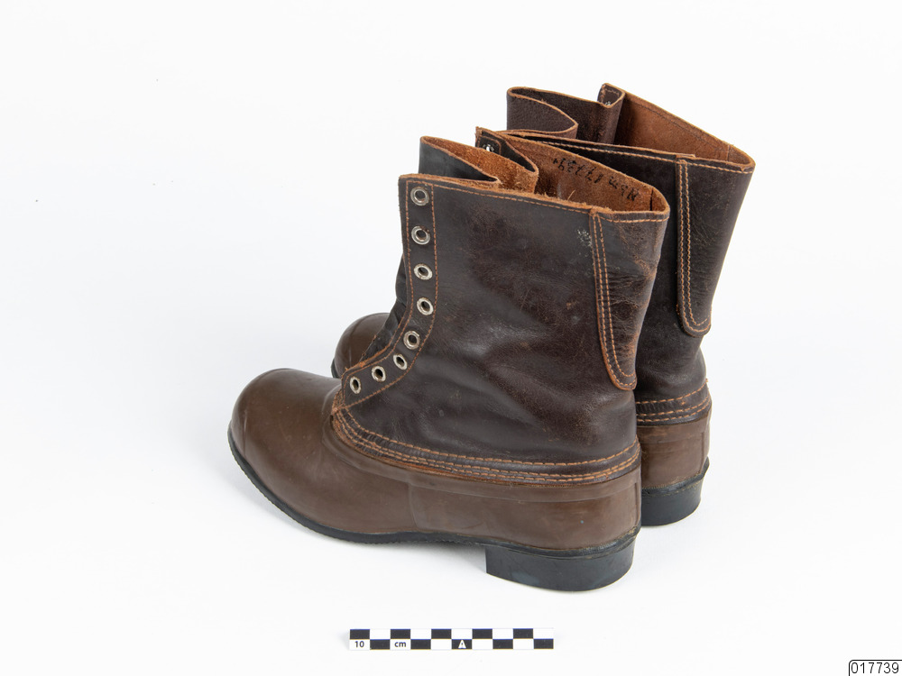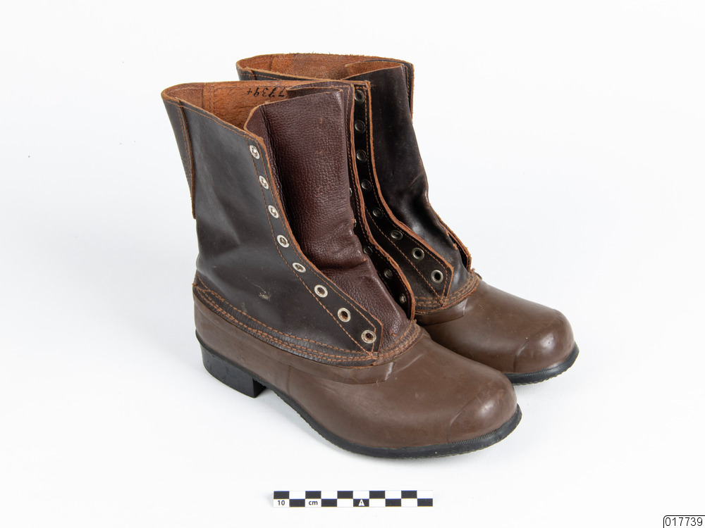 Ett par kängor. Känga med halvhögt läderskaft. Snörning framtill med söljor. Nedre delen av skon (nedanför skaftet) är av brunt gummi. Svart gummisula och klack. På klacken står: "Tretorn/Made in Sweden". Antal delar: 2 st.