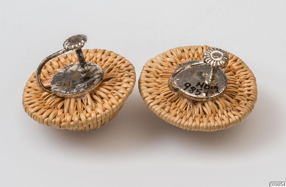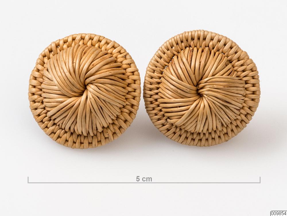 Örhänge. Ett par örhängen i rotbindningsteknik. 10 cm höga knappar med brätte. Öronklämma av metall pålimmad på baksidan.
