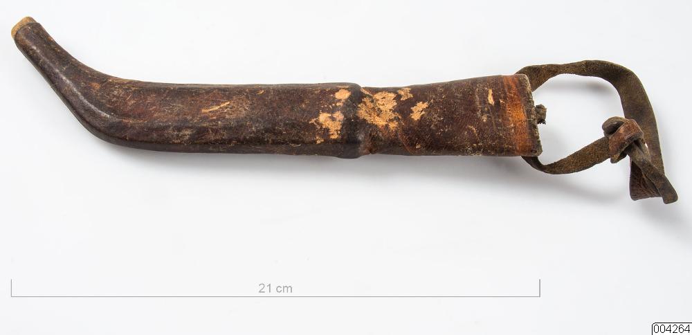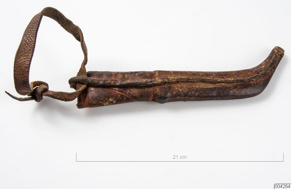 Kniv med läderslida. Den är möjligen ett samiskt arbete.